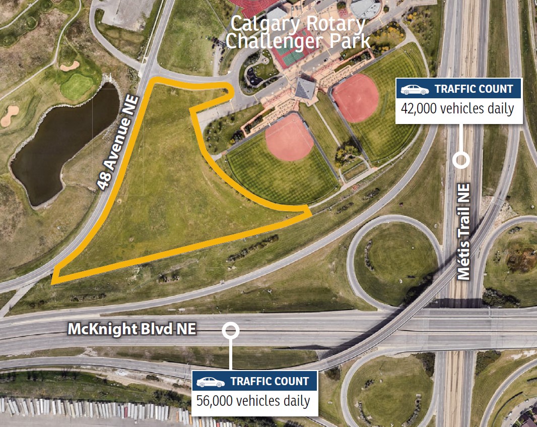 Great exposure to Métis Trail NE and McKnight Boulevard NE. Close proximity to the Calgary International Airport and numerous amenities. Potential to leverage off Calgary Rotary Challenger Park. Easy access to Barlow Trail NE.